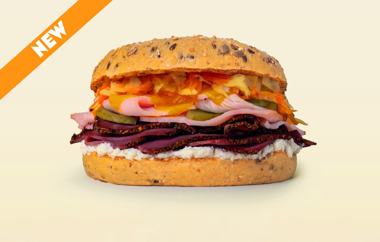 Cream cheese, pastrami, smoked turkey, cheddar, pickles and coleslaw